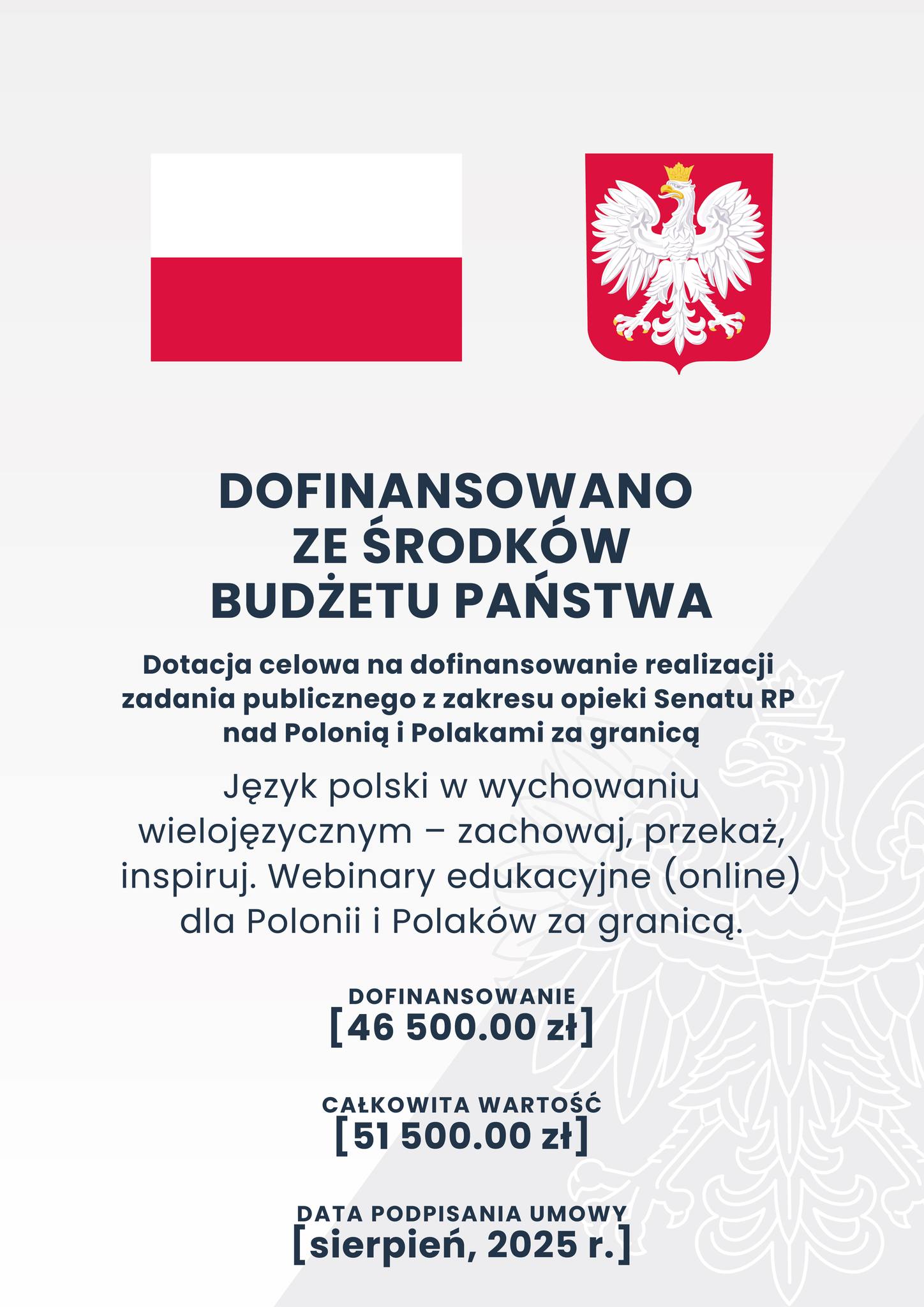 Nasz projekt „Język polski w wychowaniu wielojęzycznym – zachowaj, przekaż, inspiruj. Webinary edukacyjne (online) dla Polonii i Polaków za granicą” otrzymał dofinansowanie w konkursie Senat–Polonia 2025.
