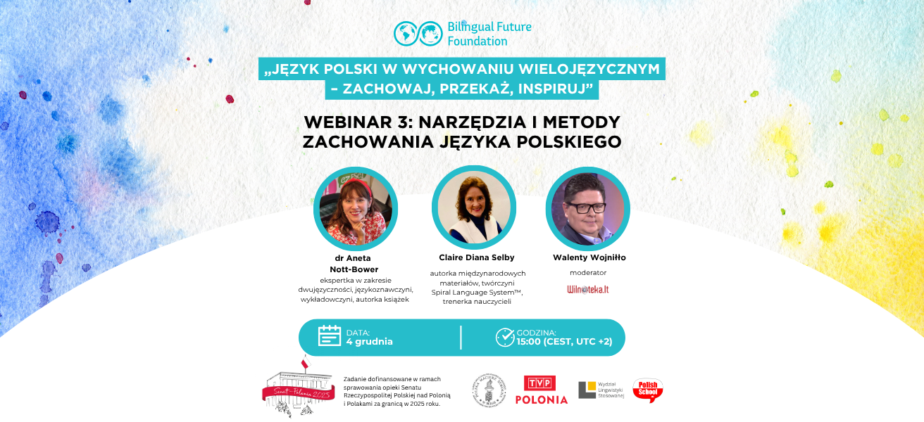 4 grudnia o godzinie 15:00 (czasu polskiego) zapraszamy na trzeci, ostatni w 2025 roku bezpłatny webinar z cyklu „Język polski w wychowaniu wielojęzycznym – zachowaj, przekaż, inspiruj”, organizowany przez Bilingual Future Foundation.